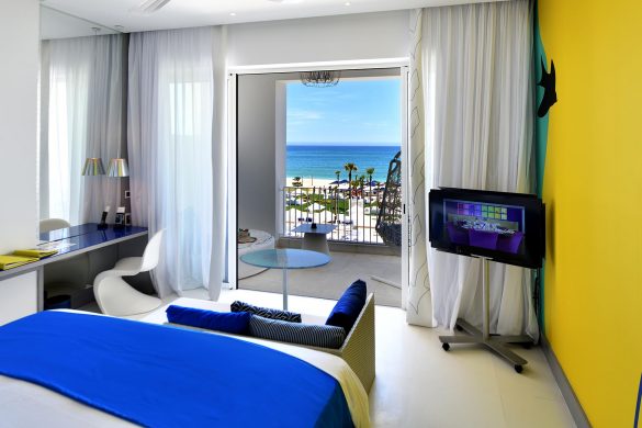 SUITE BEACH CON UNA CAMA KING SIZE Y VISTAS PANORÁMICAS AL MEDITERRÁNEO A ORILLAS DEL MAR.